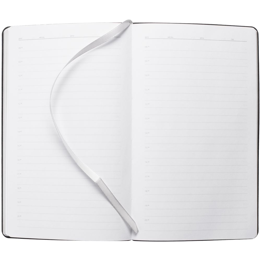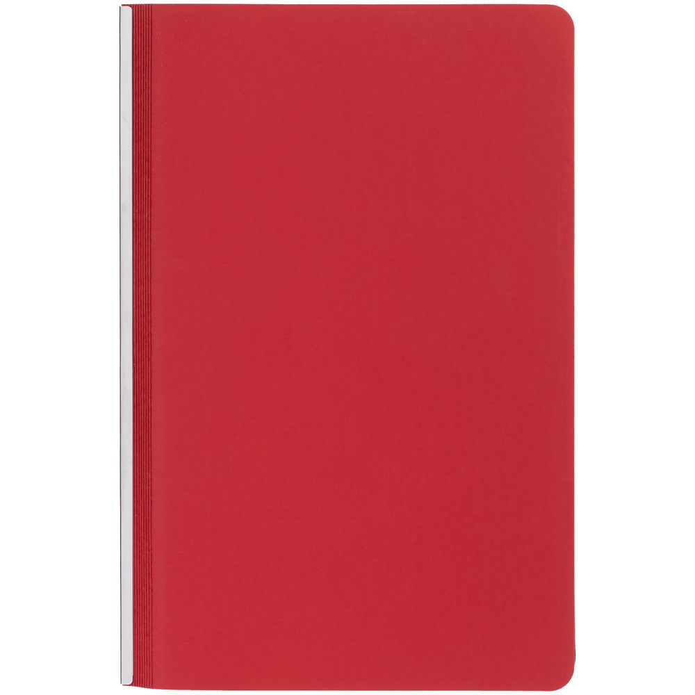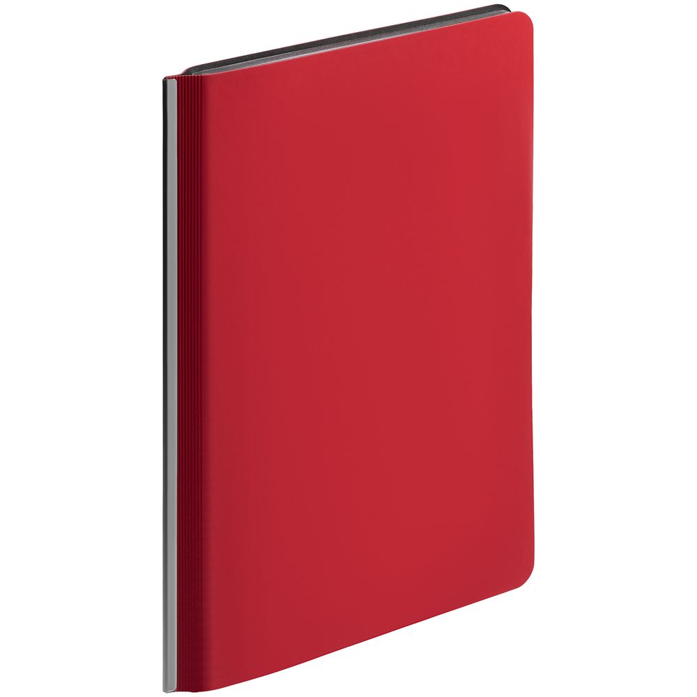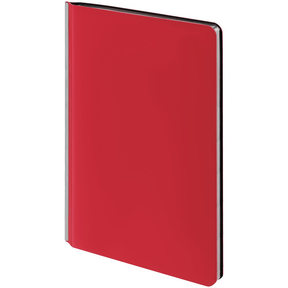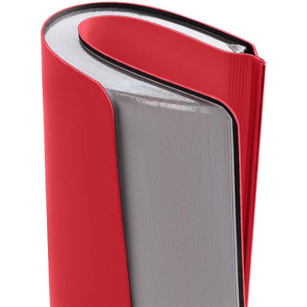 Ежедневник с гибкой обложкой и металлическим корешком, выполнен из материала Soft Touch Ultra, красный РР, дополнен серебристым обрезом блока и ляссе.