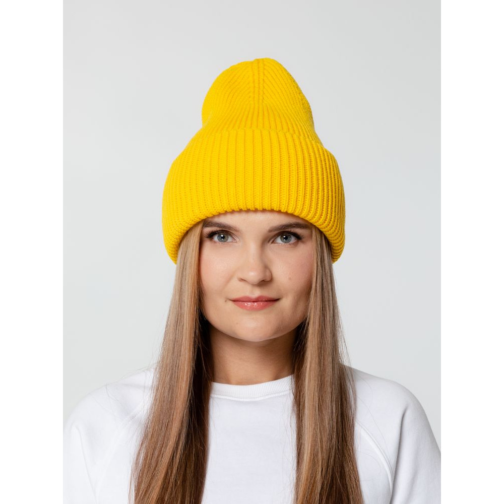Удлиненная шапка объемной фактурной вязки с отворотом.