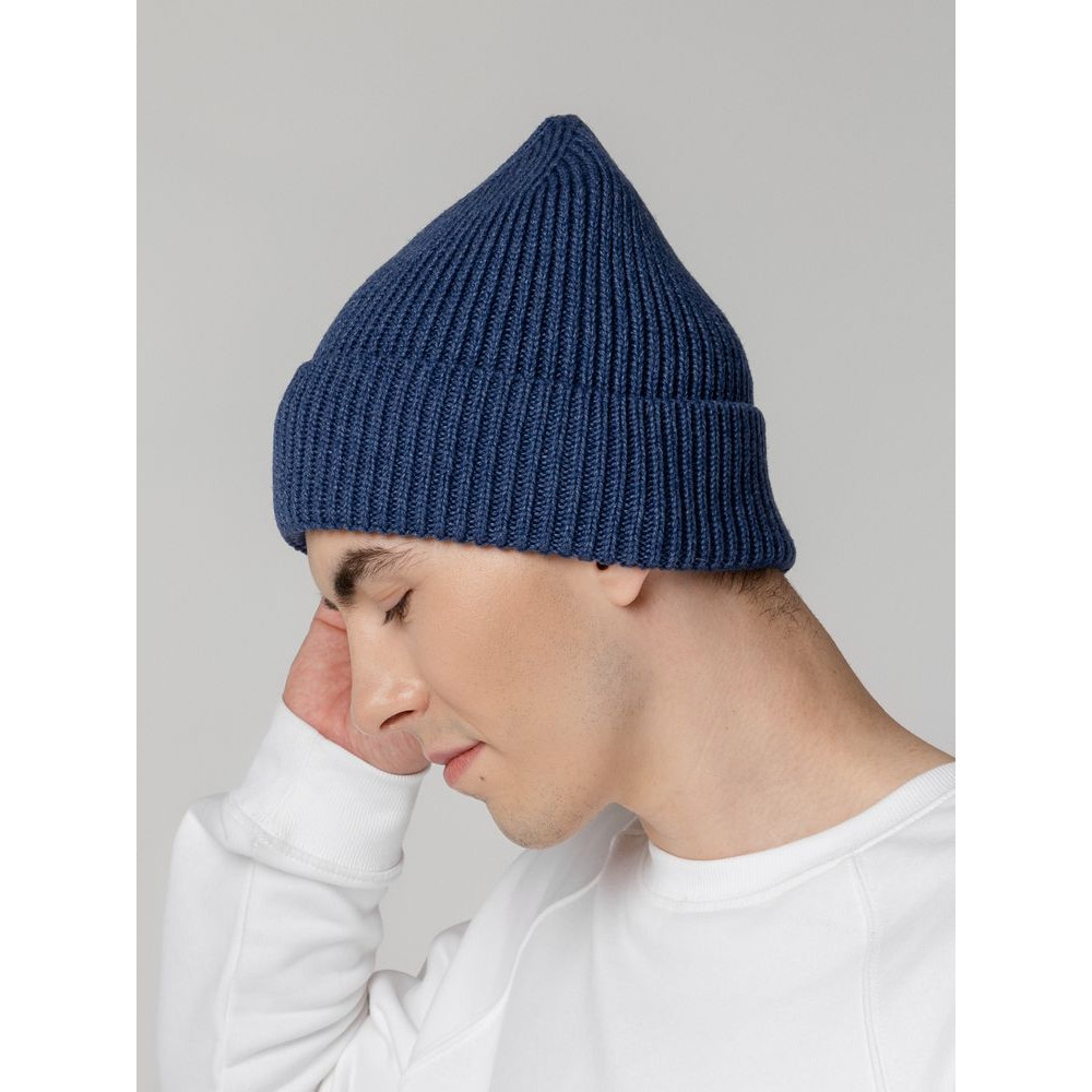 Шапка-бини из полушерстяной пряжи актуальных приглушенных оттенков. Трендовый фасон с удлиненным верхом — для расслабленного повседневного образа.