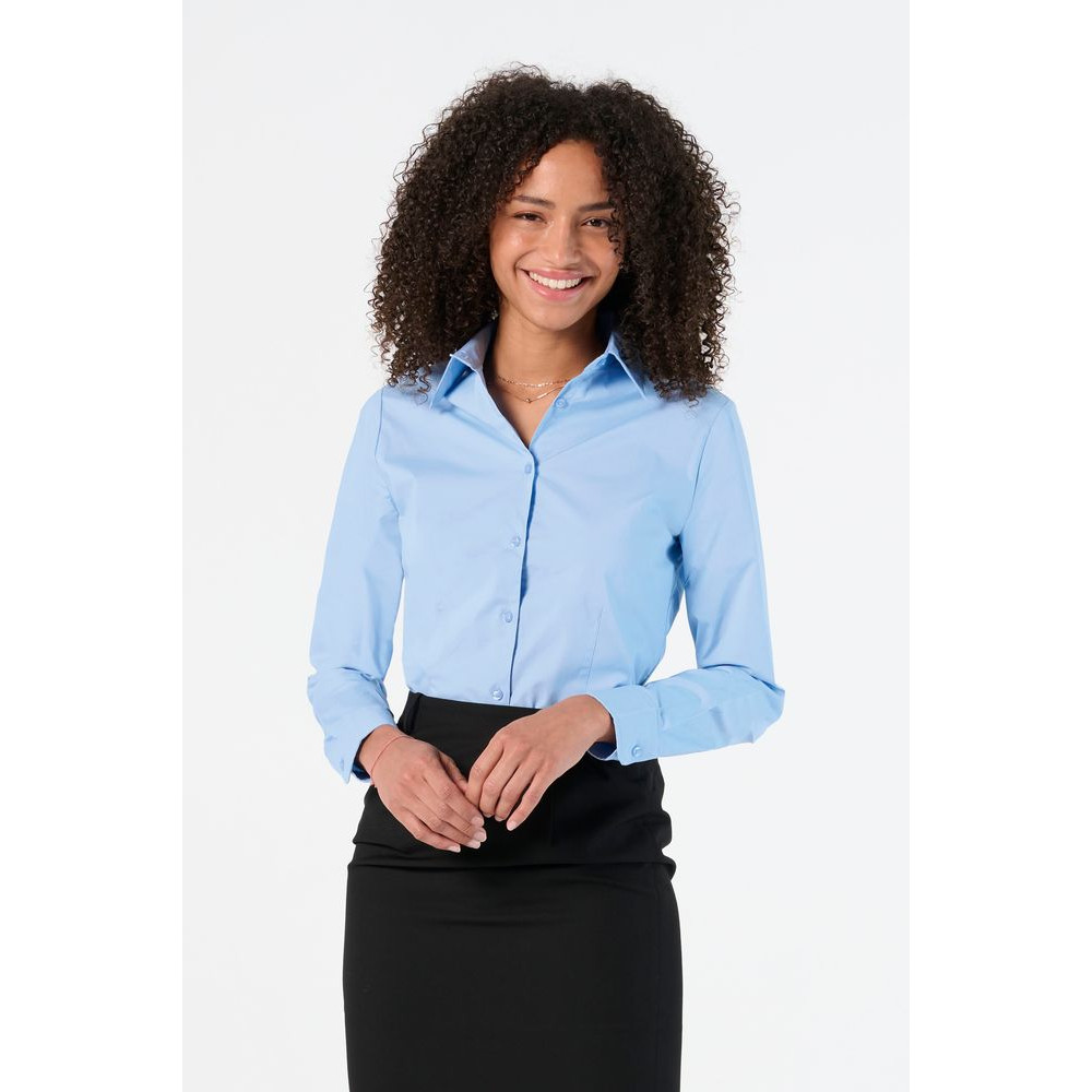 Рубашка приталенного кроя с воротником на одной пуговице. Планка на 7 пуговиц в тон, манжеты на 2 пуговицах, вытачки спереди и на спинке.