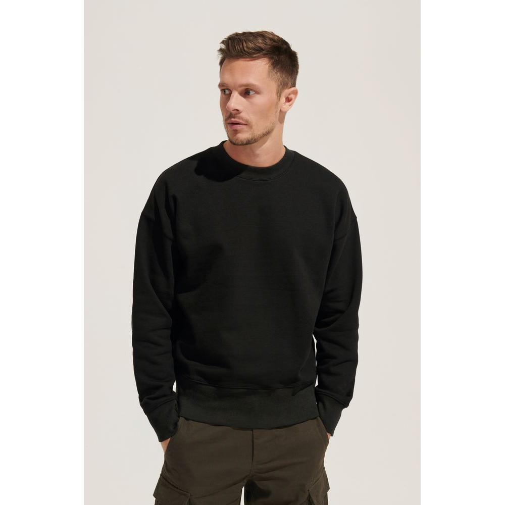 Плотный свитшот унисекс свободного кроя со спущенным плечом и широким поясом.