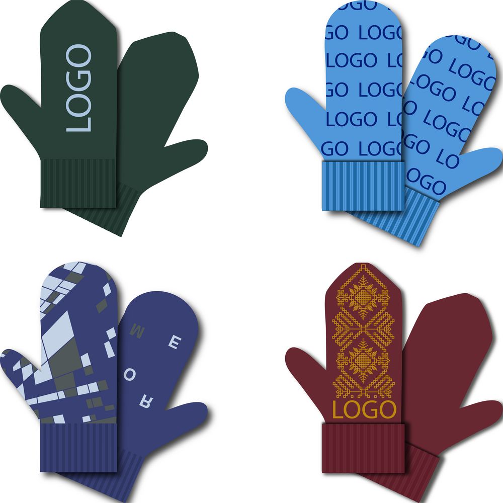 Варежки с вывязанным логотипом и индивидуальным рисунком в фирменной цветовой гамме.