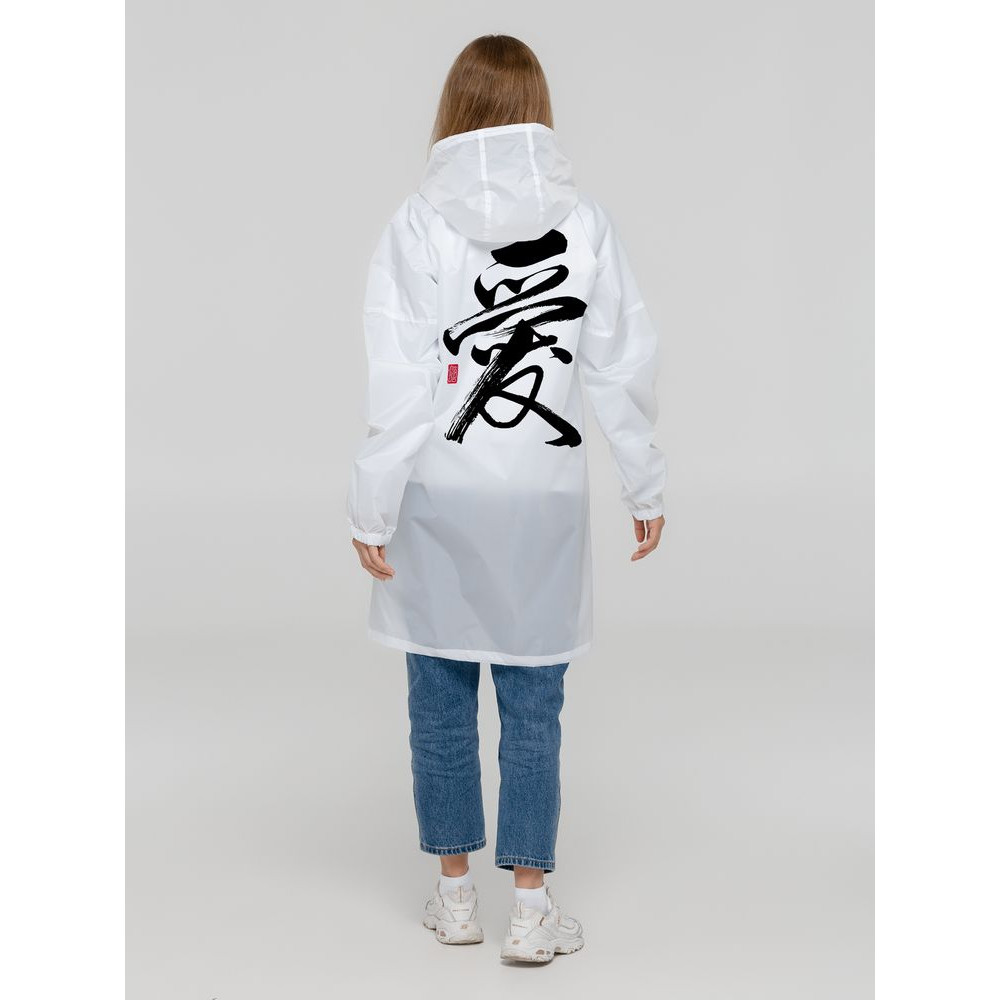 Иероглифы коллекции «Вечные ценности» выполнены в жанре каллиграфии на древнекитайском диалекте мандарин. Плавные линии символизируют внутренний баланс и фокусировку на главных жизненных ориентирах.Плащ-дождевик из ткани таффета на молнии с капюшоном. Складывается в мешочек — удобно брать с собой.