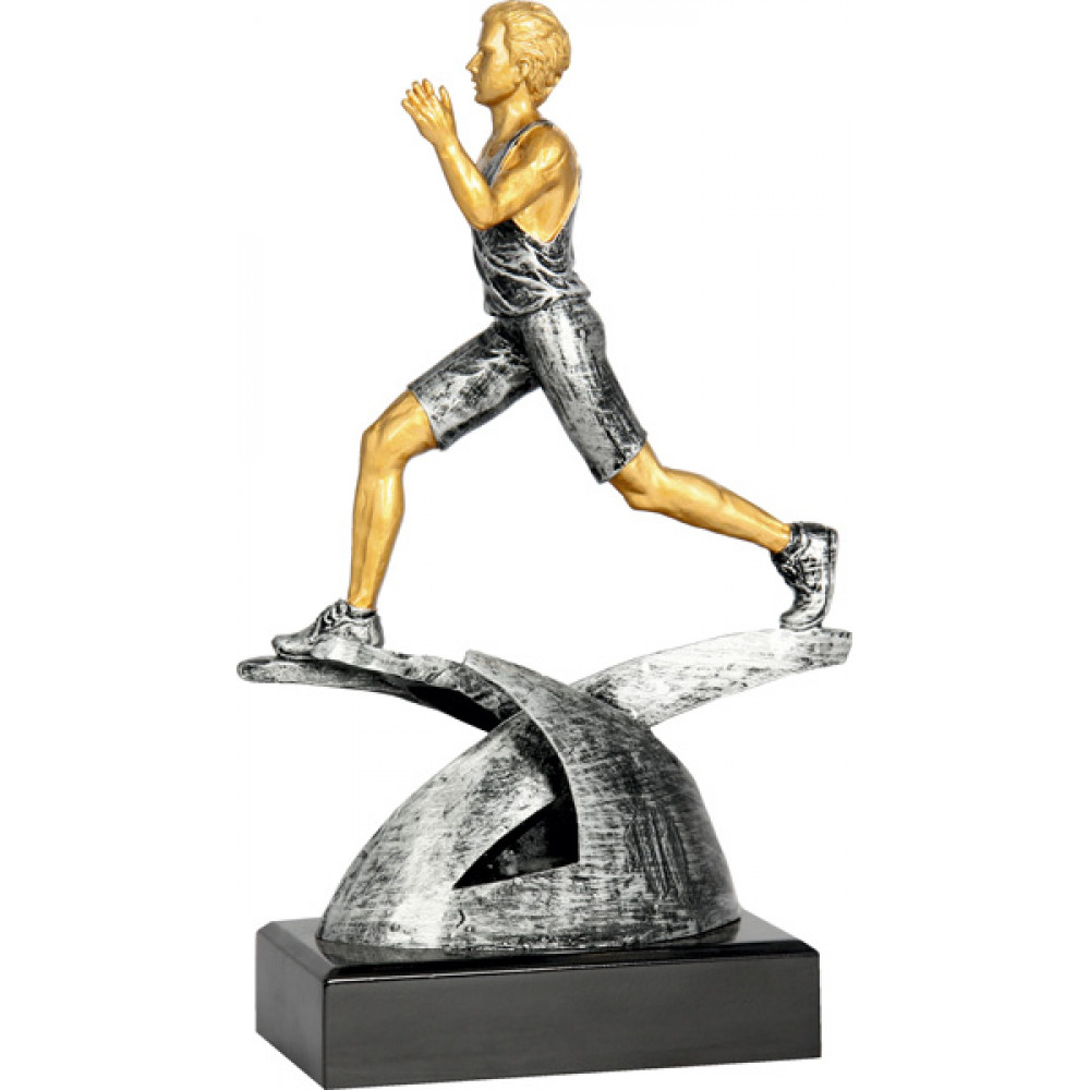 Фигурка литая "Бег". Материал: пластик. Высота 21; 24; 26 см. Изображен бегущий спортсмен, одетый в майку и шорты, на ногах кроссовки. Фигурка спортсмена установлена на две дуги, на которые опираются ноги спортсмена. Фигурка установлена на цоколе в форме прямоугольника, цвет черный.