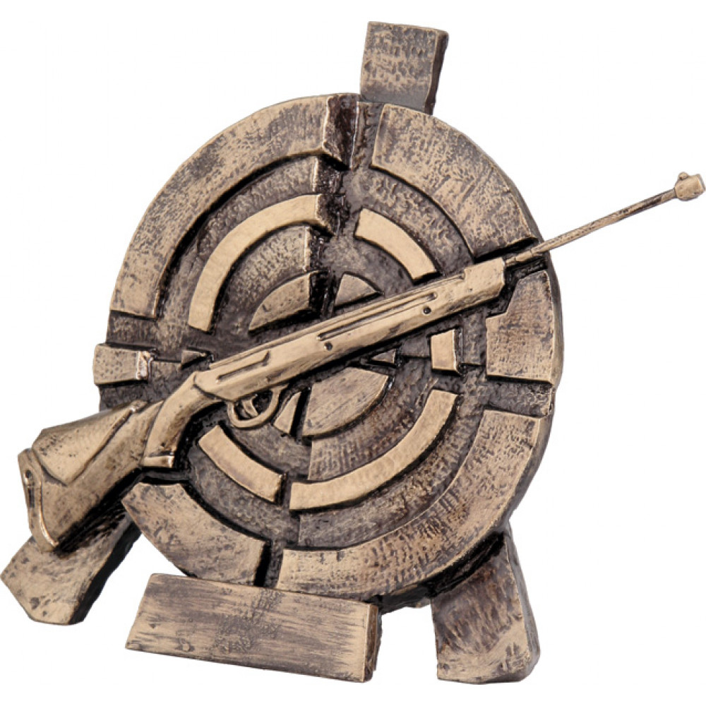 Фигурка литая "Стрельба". Цвет бронза. Материал: пластик. Высота 16 см. Изображена мишень, стоящая на трех опорах. Поверх мишени по диагонали изображена винтовка. Под мишенью расположено место прямоугольной формы для нанесения персонализации.