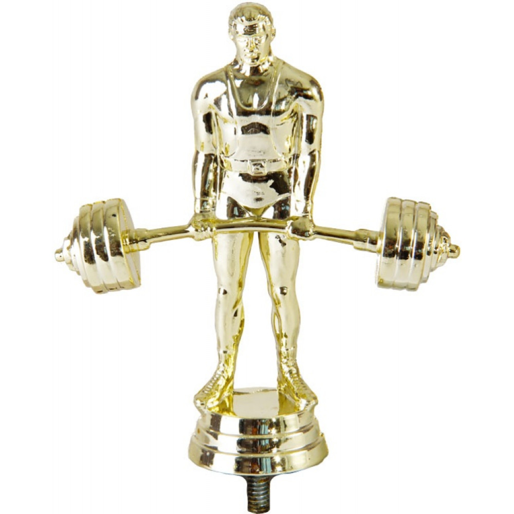 Цвет: золото, материал: пластик. Вид спорта: тяжёлая атлетика. Фигурка выполнена в виде фигуры мужчины, в руках которого тяжёлая штанга. В середине штанга прогнулась от веса металлических блинов. Руки мужчины немного согнуты в локтях, мышцы напряжены. Голова мужчины наклонена вниз. Ноги стоят на ширине плеч, на ногах –кроссовки. Ниже - круглое основание, на котором имеются горизонтальные линии. Высота, см: 12.7 Вес, кг: 0.046. Фигурку возможно закрепить на цоколь, постамент или кубок.