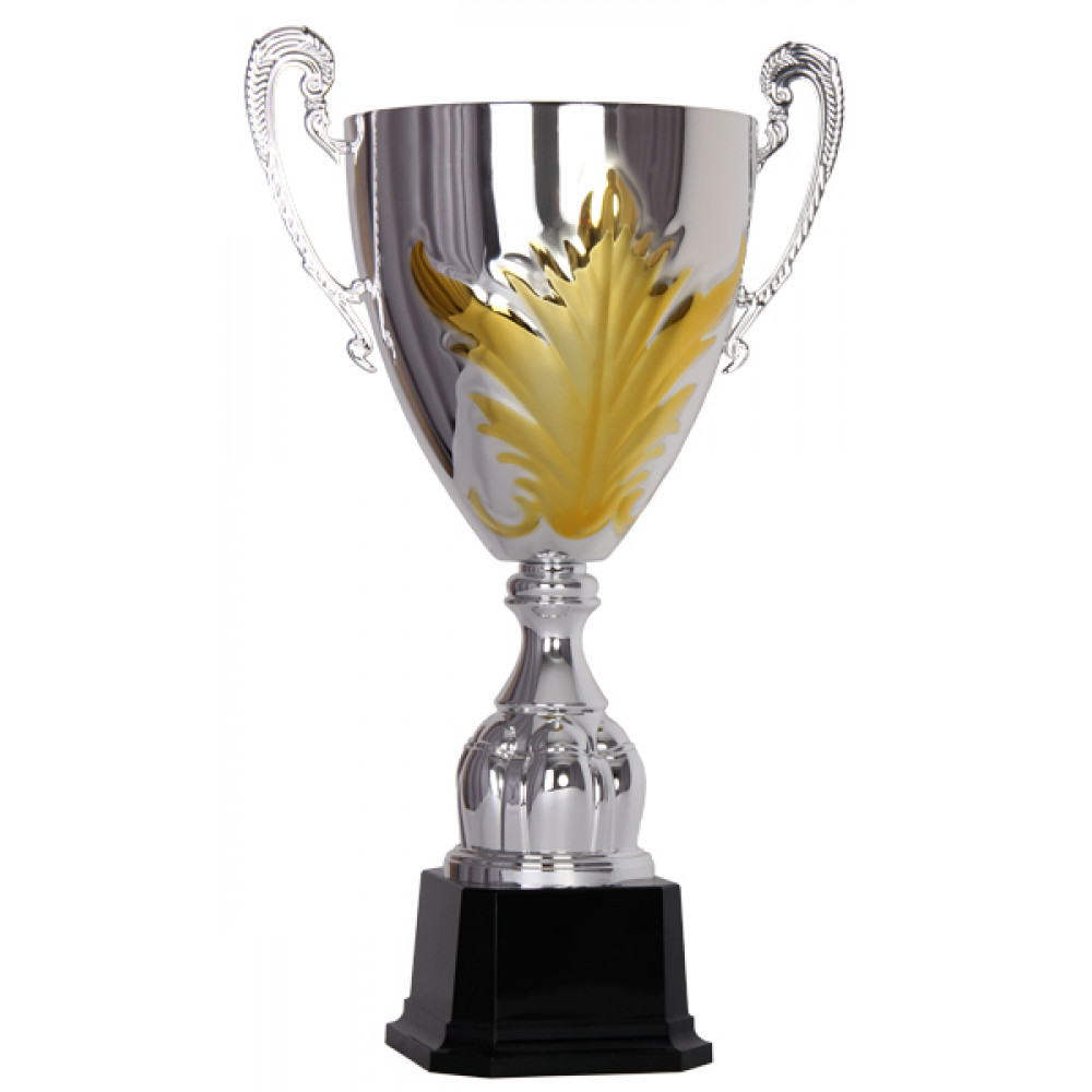 Кубок состоит из трех элементов: чаша, стем, цоколь. ¶Чаша кубка изготовлена из стали с гальваническим покрытием, цвет внутри - серебро, снаружи - серебро, золото. ¶На чаше с двух сторон выштампован рельеф в виде листа, окрашенного золотым цветом.¶К чаше прикреплены ручки, выступающие за её края, цвет - серебро. Ручки украшены рельефом в виде изогнутых линий. ¶Стем конусообразный под серебро, с декоративными выпуклыми элементами в виде колец по центру стема в количестве 4-х штук, у основания стем расширяется декоративным элементом в виде кольца.¶Цоколь кубка в виде шестигранной пирамиды, материал пластик, черного цвета, с отступом у основания.