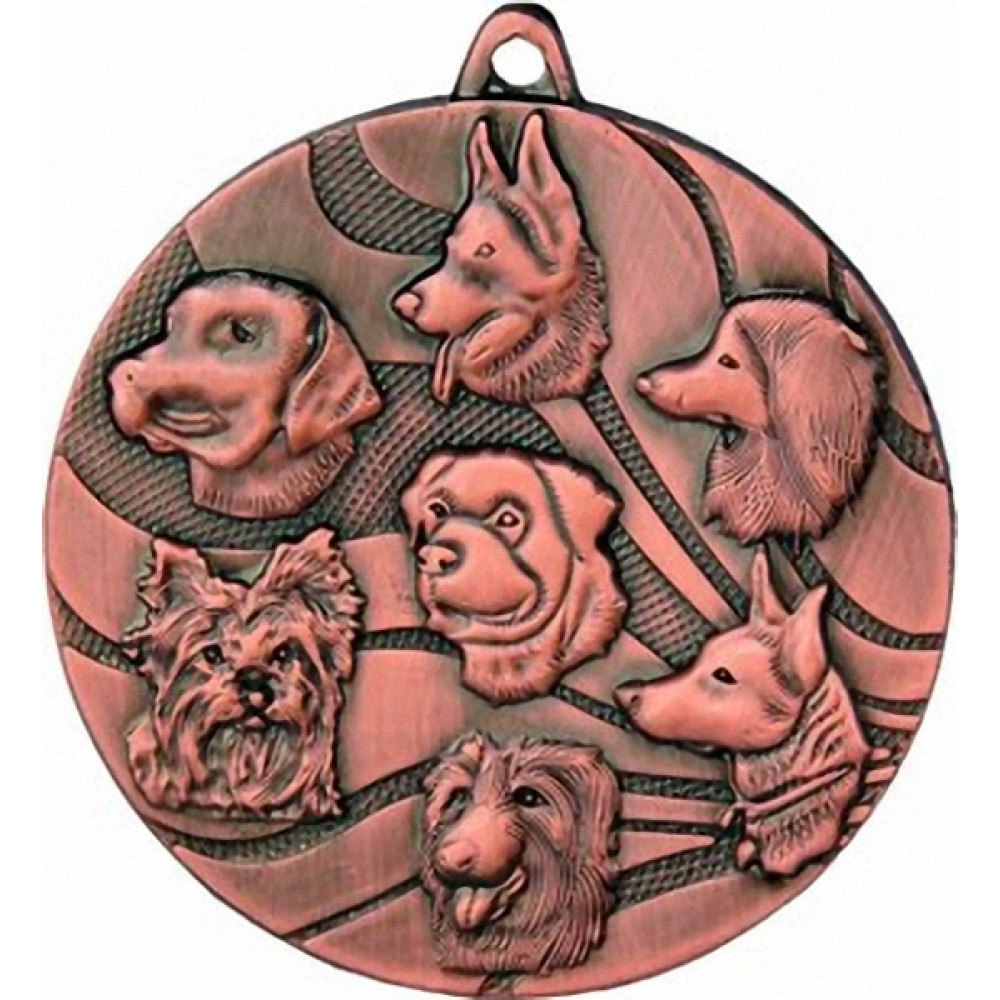 Медаль круглая металлическая. Диаметр 50 мм, толщина 3 мм.¶Цвет медали, имитирующий золото/серебро/бронзу.¶Сверху расположено круглое ушко для крепления ленты. ¶На аверсе медали нет места под вставку. ¶В центре медали изображена одна голова собаки, напоминающей породу бульдог (с треугольными нестоящими ушами), вокруг этой центральной головы размещены еще пять изображений других пород собак (только голова) одинакового размера. Из этих собак три - со стоящими ушами, вверху –немецкая овчарка) и три породы с нестоящими ушами, чередуются. У самого верхнего (немецкая овчарка) и самого нижнего изображения - пасть открыта и высунут язык.¶Фон медали из мелких ромбов, почти сливающихся в выпуклые точки. Поверх данного узора расположены толстые линии (8 штук) в виде извивающихся на ветру лент, которые отходят от правой стороны в левую.¶На медали нет никаких других изображений и рисунков.