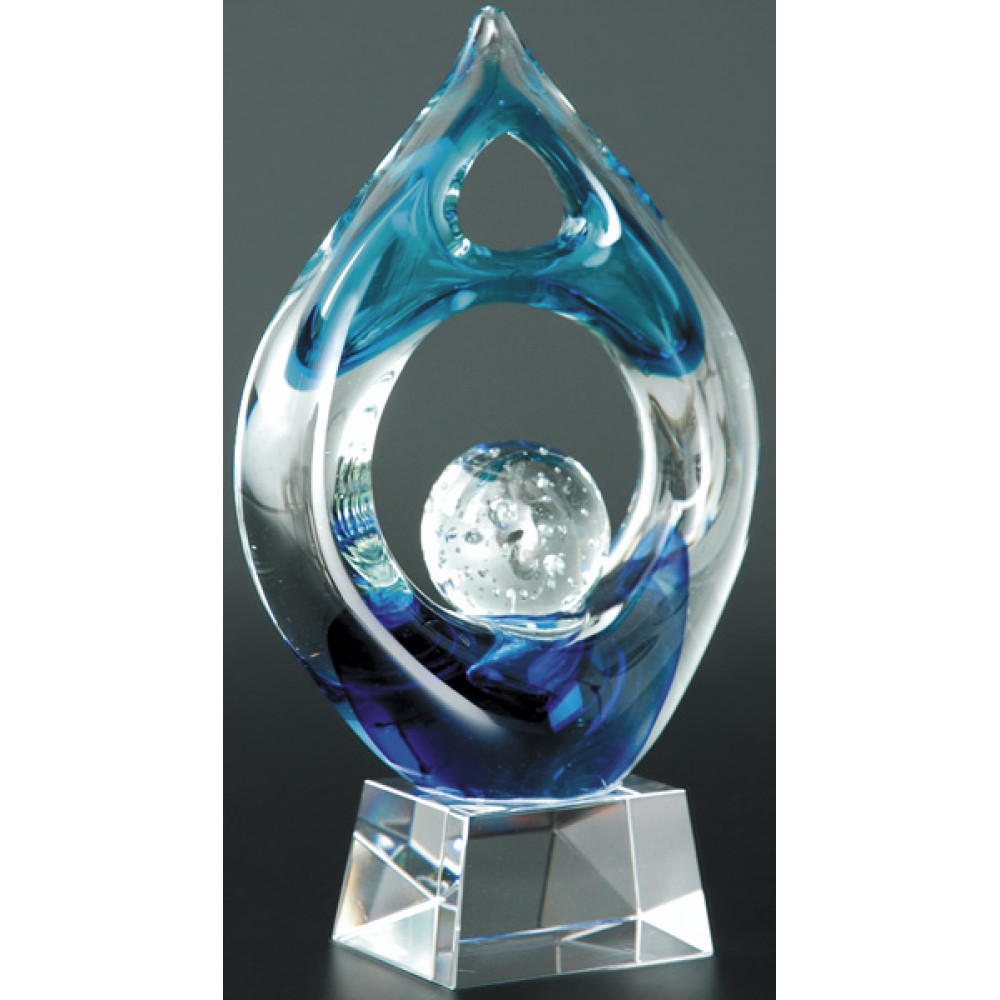 Награда хрустальная "Капля". Представляет собой овал, посередине расположен элемень в форме шара, фигура синего неоднородного цвета. Установлена на прозрачном стеклянном элементе в форме усеченной пирамиды.