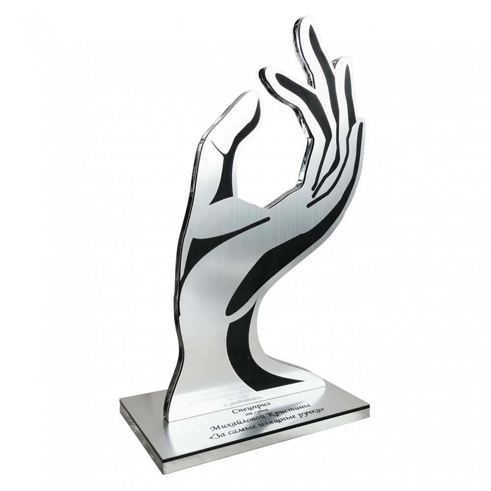Приз состоит из основания и самой фигуры. Элементы статуэтки вырезаются лазером из двух слоев акрила толщиной от 3 до 10 мм и одного слоя пластика толщиной 0,8, 1,6 или 3,2 мм.