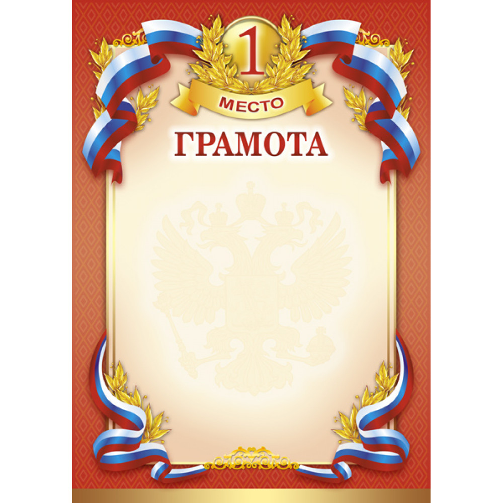 Грамота, формат А4. Бумага матовая, толщина 200 гр, полноцветная печать. ¶Грамота красного цвета. Посередине находится прямоугольник светло-красного/светло-синего/светло-зелёного цвета для нанесения персонализации. В углах прямоугольника изображены Российские ленты и золотые лавровые ветви, в центре верхней стороны изображен круг с цифрой "1", который огибают лавровые золотые ветви, под кругом расположена лента с надписью "место". Ниже написано слово "Грамота" красным цветом. В середине светлого фона изображен герб России, светло-красного/светло-зеленого/светло-синего цвета. На красном/синем/зеленом фоне грамоты изображен узор в виде ромбов.