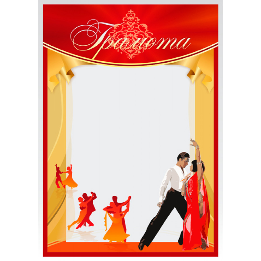 Грамота, формат А4. Бумага матовая, толщина 200 гр, полноцветная печать. ¶На грамоте изображены желтые театральные шторы, между ними белый фон, в верхней части полукругом расположен красный элемент, на котором написано слово "Грамота" курсивным шрифтом бело-желтого цвета, за словом изображен растительный узор. В нижнем правом углу изображена пара танцоров, мужчина в черных брюках и белой рубашке, женщина в красном длинном платье. На заднем плане изображены три пары силуэтов танцоров. Грамота имеет красную окантовку.