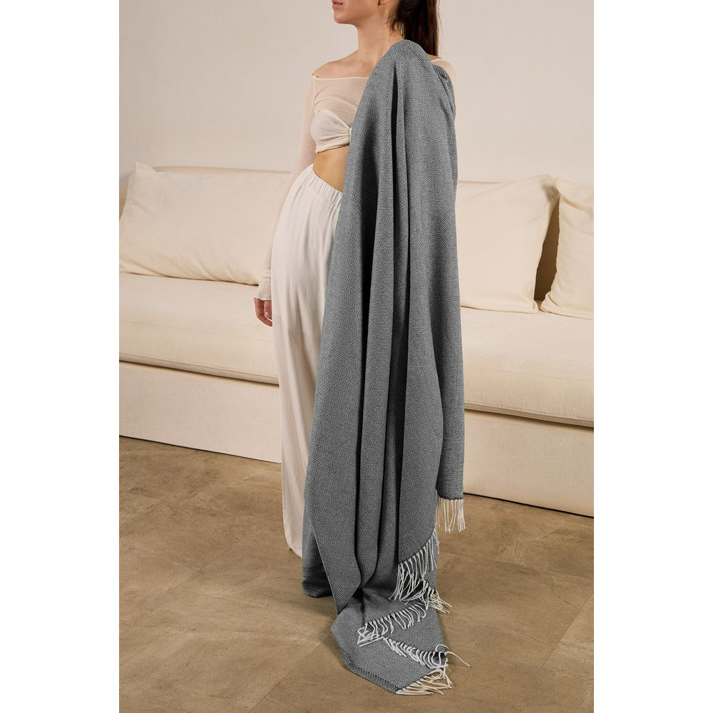 Классический рисунок «елочка» не слишком привлекает внимание, но в то же время добавляет изюминки. Смешанный состав пряжи продлевает срок службы и существенно облегчает уход за пледом.