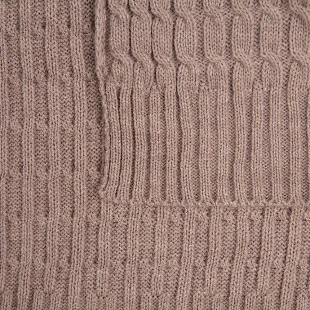 Модель: однотонный плед с фактурной вязкой, которая позволяет сделать его воздушным и объемным. Чередуя различные типы петель на гладком полотне, можно вывязать любую графику — логотип, текст, товарный знак.