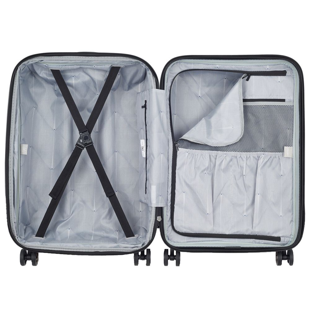 - Чемодан с 2 отделениями: одно из них с фиксирующими ремнями, второе — с разделителем и карманом-органайзером на молнии