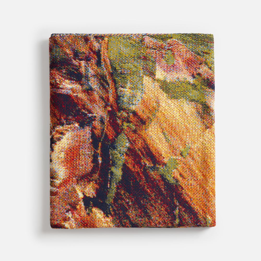 Модель: плед жаккардовой вязки, гладкая поверхность, 6-8 цветов нитей в одном ряду, рябая изнанка.
