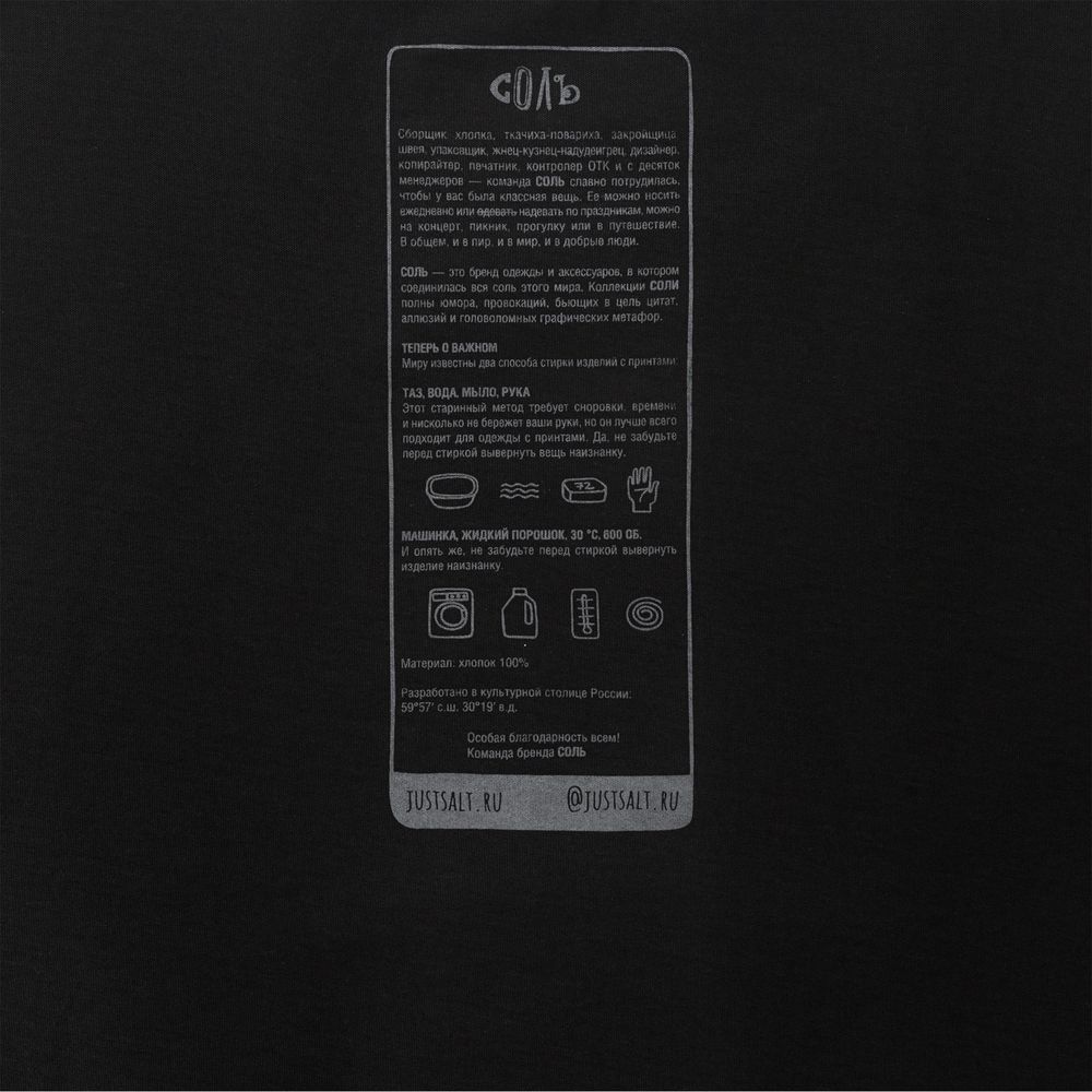 Принт с информацией о бренде и инструкцией по уходу за изделием на изнаночной стороне футболки.