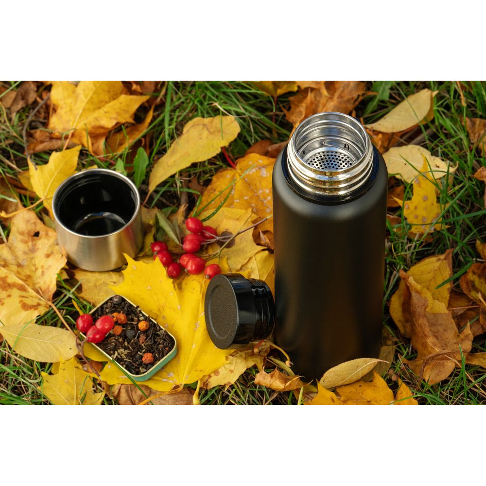 Термос в строгом металлическом корпусе с вакуумной изоляцией. Завинчивающаяся пробка, крышка-чашка и ситечко для фильтрации — удобно заваривать чай или кофе. Напиток останется горячим, а чаинки не попадут в чашку.