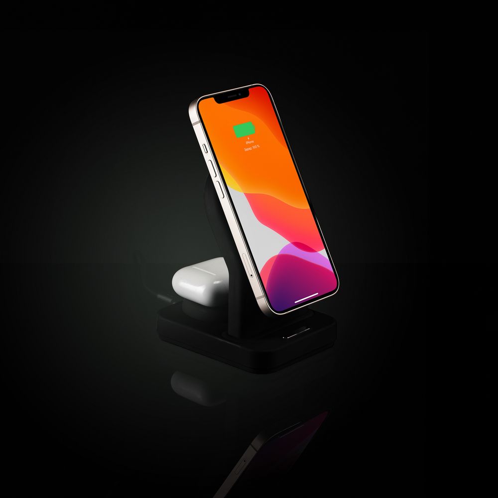 iPhone 12–15 c магнитами MagSafe могут удерживаться на основной области станции. Ранние или компактные модели iPhone или смартфоны с диагональю 5,7–6" на OS Android можно оснастить специальным адаптером Magmate или чехлом со встроенным кольцевым магнитом сзади.
