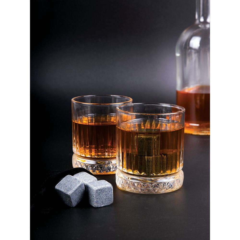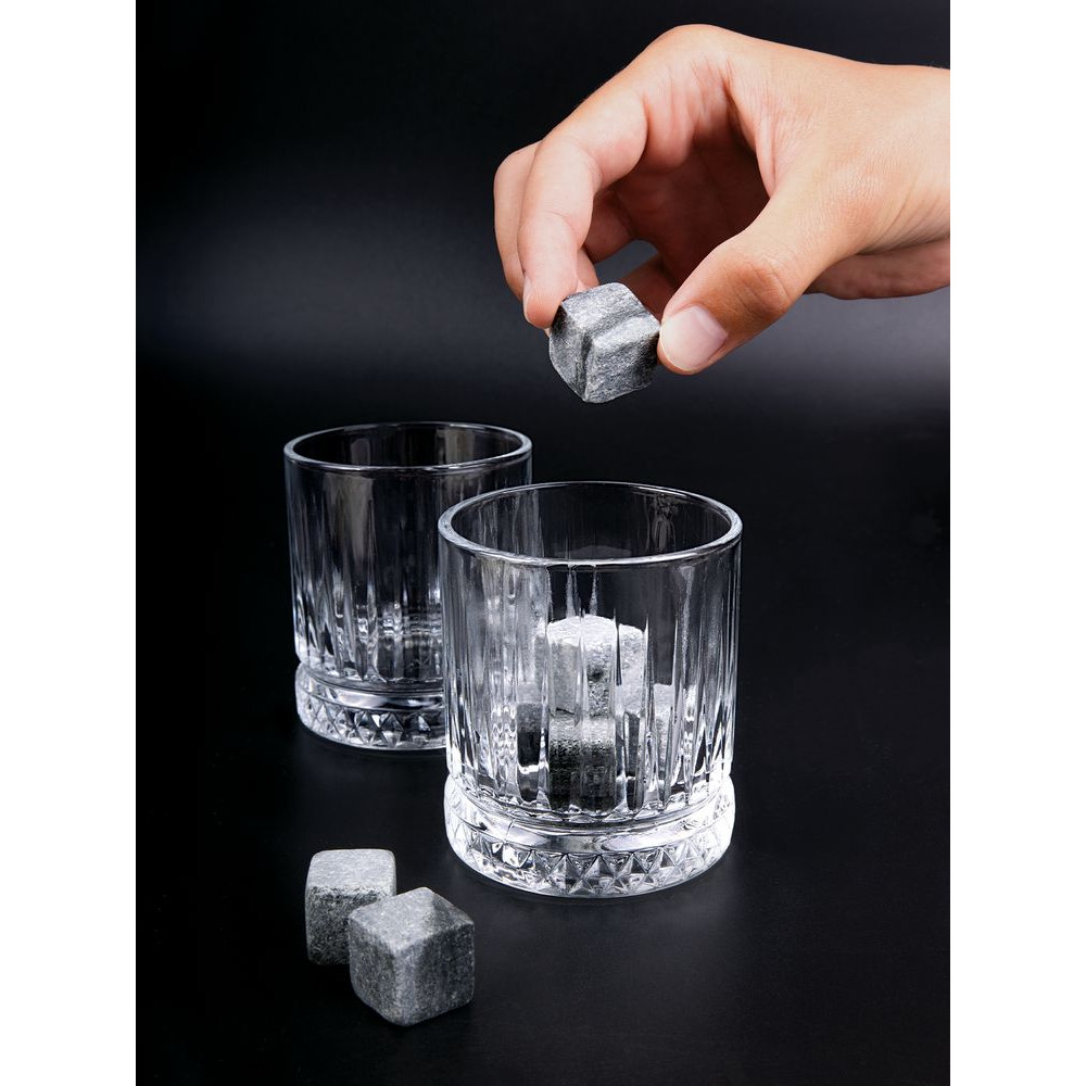 Благодаря высокой теплоемкости и теплопроводности камни охлаждают гораздо лучше льда и при этом не тают, а значит, не разбавят напиток и не изменят его вкусовых свойств.В наборе: 2 стакана (210 мл), 8 камней для виски, мешочек для камней.