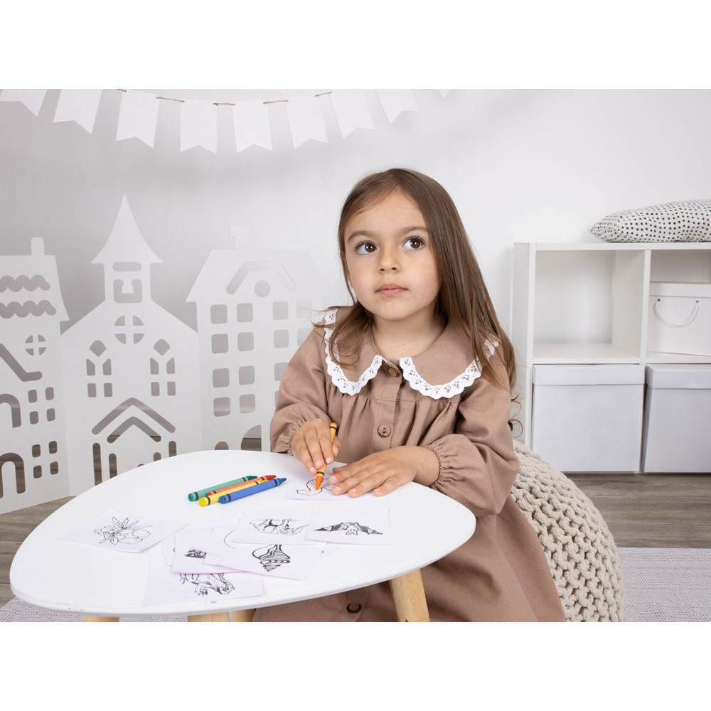 В комплекте 5 цветных восковых мелков и 20 листов с картинками для раскрашивания.