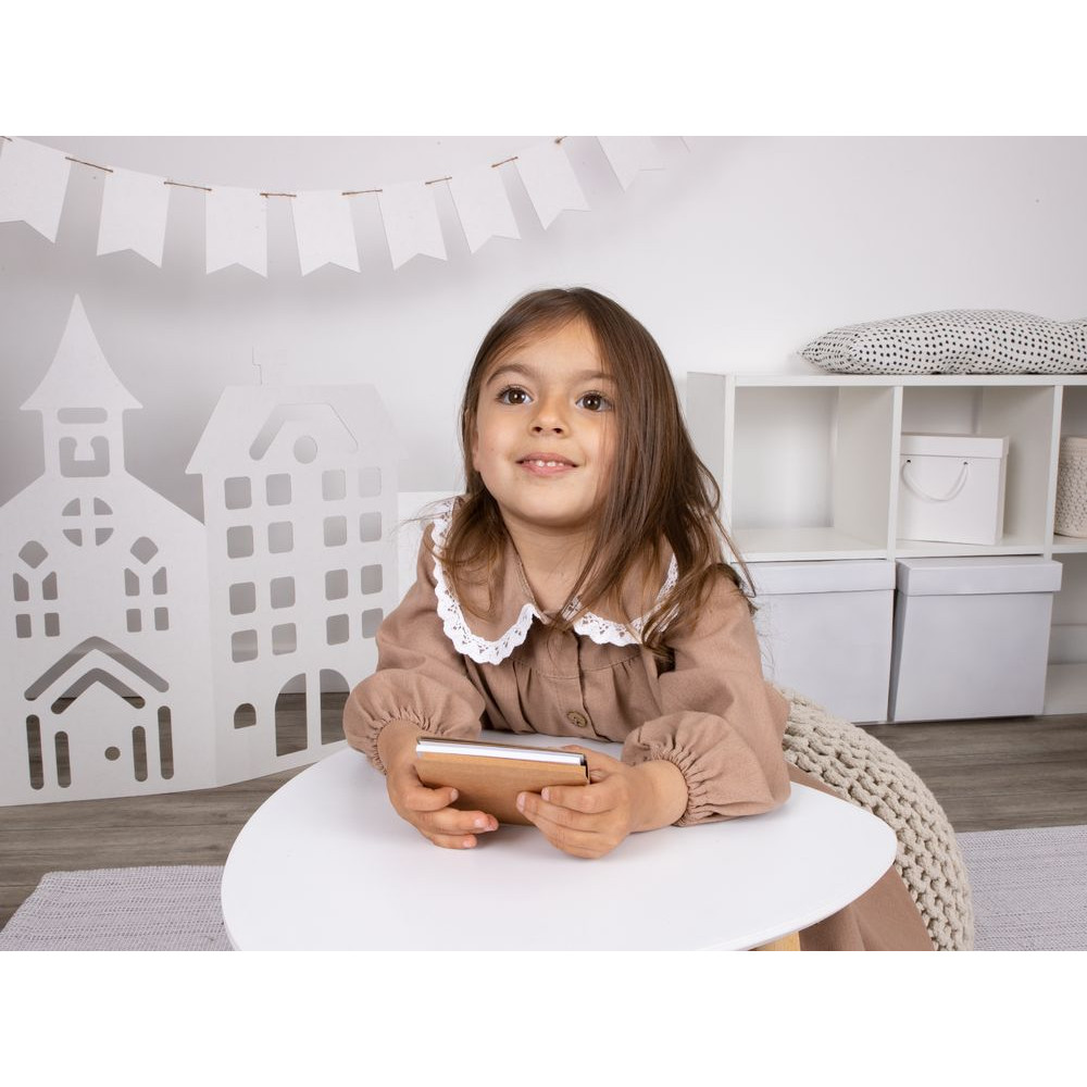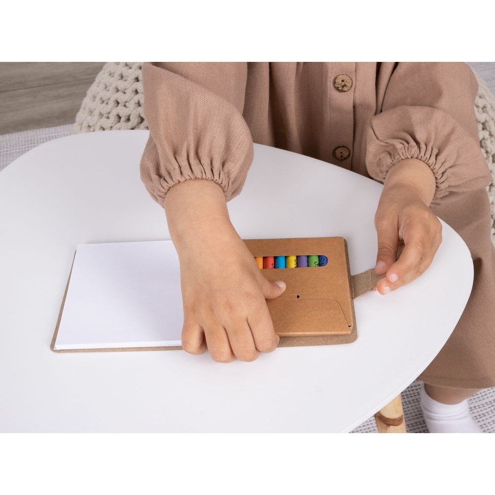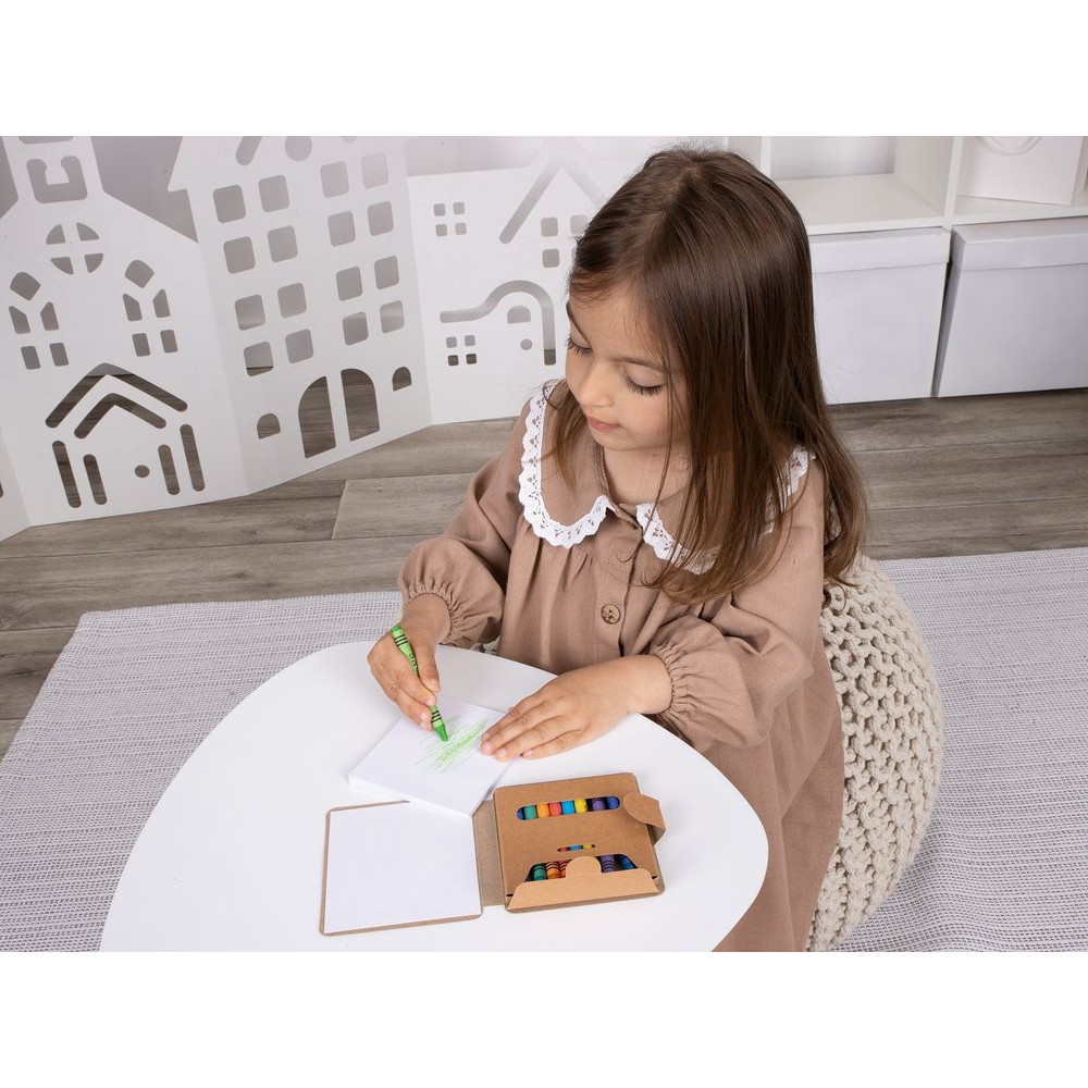 В комплекте 11 цветных восковых мелков и блокнот на 40 страниц для раскрашивания и рисования: 12 страниц с рисунками и 28 чистых страниц. Блокнот и мелки компактно хранятся под одной обложкой.