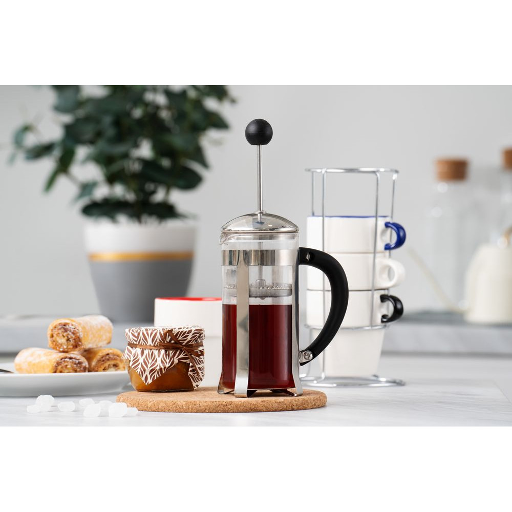 Элегантная оправа из нержавеющей стали защитит колбу от повреждений, а пластиковая ручка не даст обжечься о горячую поверхность.
