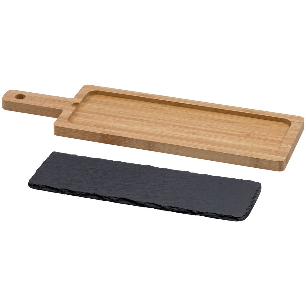 Сервировочная доска из бамбука со сланцевой вставкой может использоваться для оригинальной подачи сыра, хлеба и любых других закусок. За сланцевой посудой легко ухаживать, она не подвержена распространению грибка и бактерий. Перед первым применением доску следует помыть с использованием моющих средств.