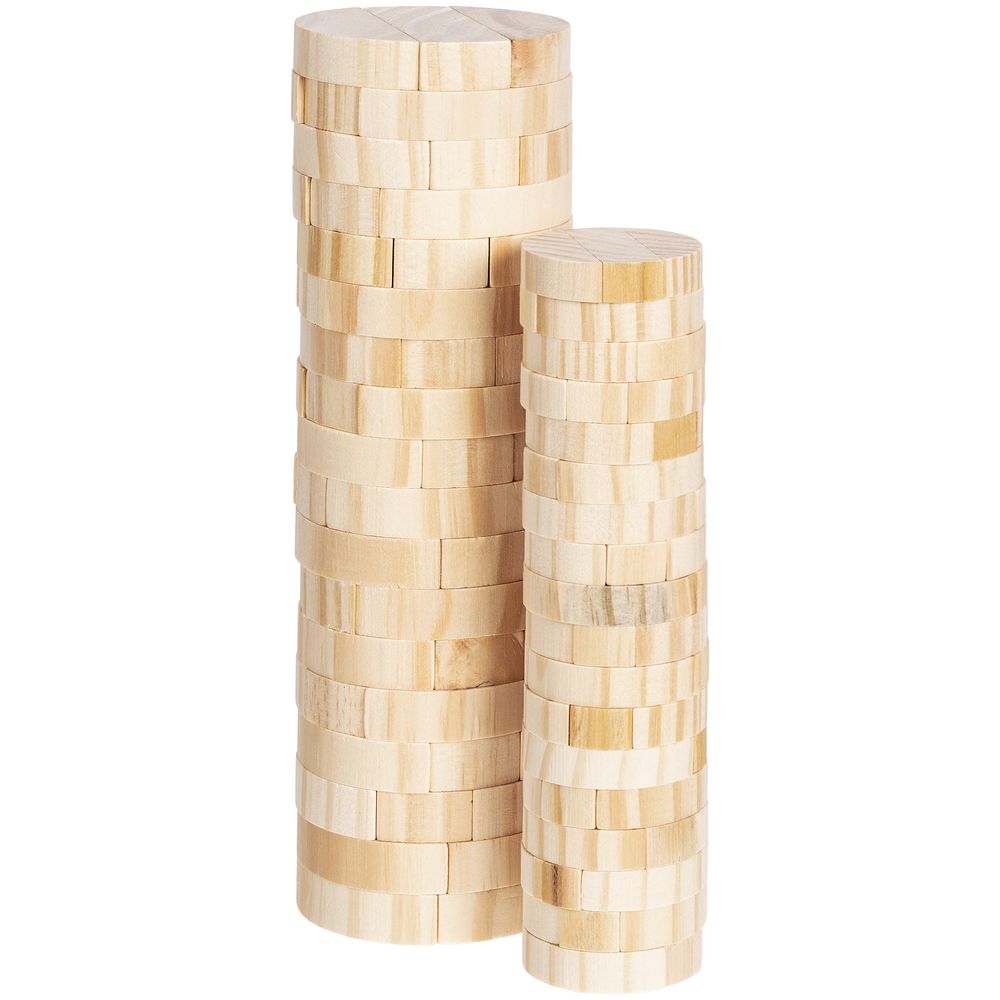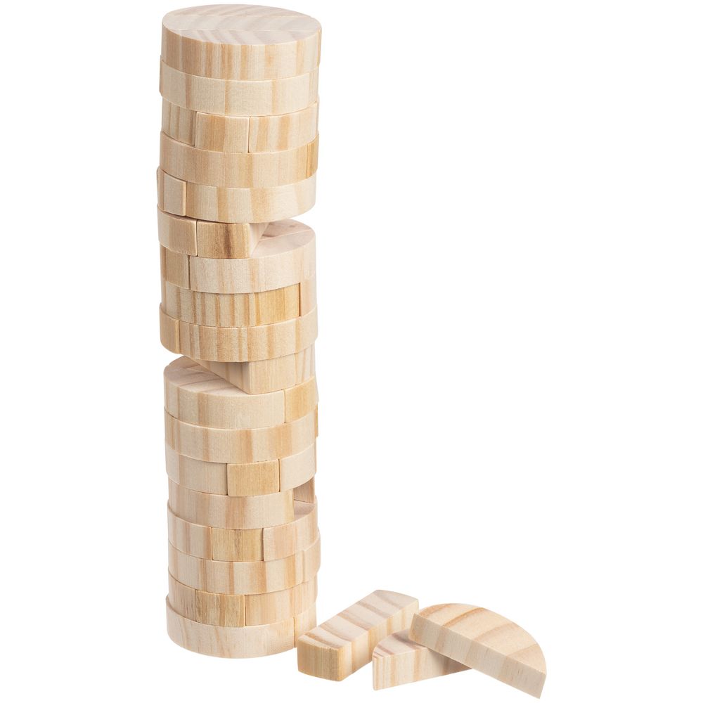 Игра состоит из 54 деревянных брусочков (18 этажей). Поставляется в черной картонной коробке с контурным изображением башни. Инструкция с правилами в комплекте.