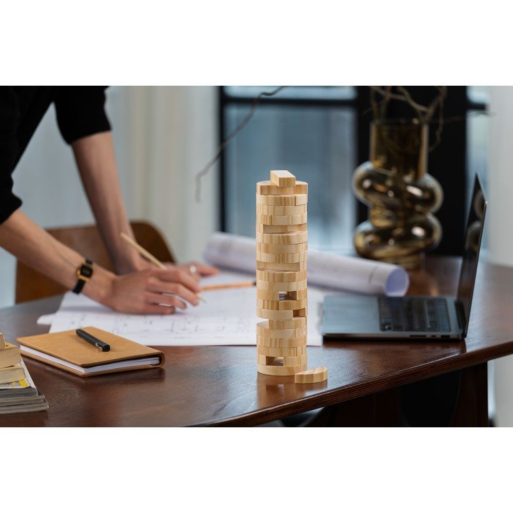 Правила игры просты: сначала строится башня — по три брусочка в ряд, каждый слой перпендикулярен предыдущему. Затем игроки по очереди вытаскивают по одному брусочку и кладут его на верх сооружения. Тот игрок, кто обрушит башню, проиграл.