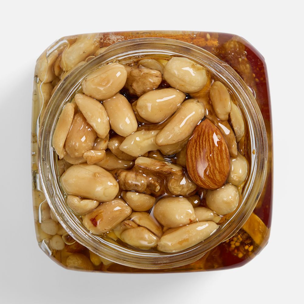 Медовый десерт с богатым составом: жареные орехи, яркие цукаты и полезные семена. Эффектный внешний вид делает продукт идеальным для подарка.