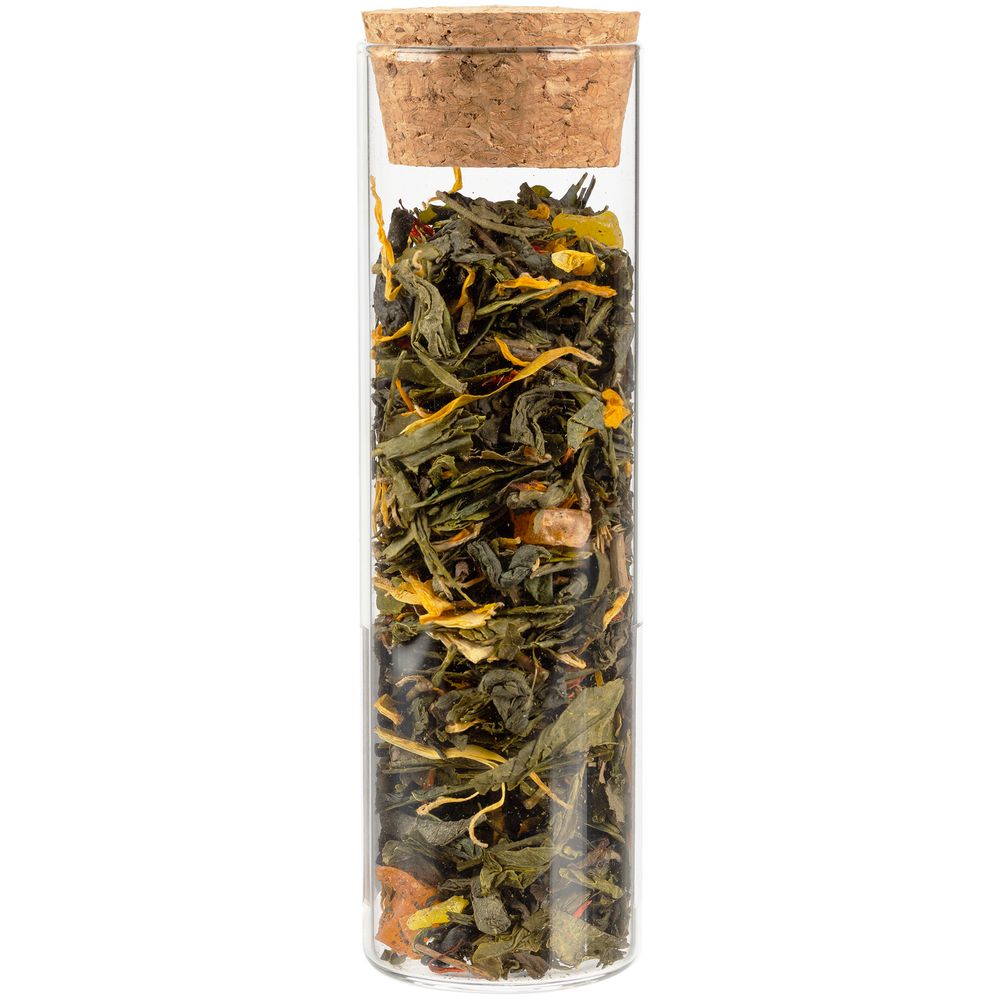 - чай зеленый «Восемь сокровищ Шаолиня» (состав: сенча, зеленый чай ганпаудер, папайя, лепестки сафлора, лепестки календулы, ароматизатор «клубника»), вес 25 г;